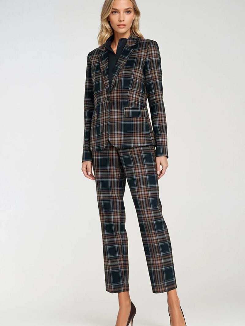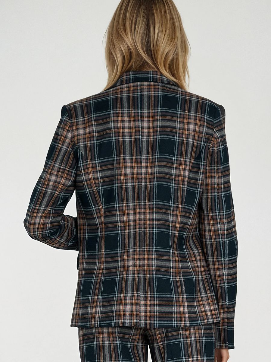 Une veste รฉlรฉgante ร la coupe ajustรฉe, mettant subtilement en valeur la silhouette. รquipรฉe d’un col classique ร revers, de manches longues et d’รฉpaulettes cousues, ce qui lui confรจre une ligne impeccable et marquรฉe. La veste se ferme par un seul bouton, ajoutant ainsi une รฉlรฉgance minimaliste. ร l’avant, il y a des poches pratiques ร rabat. Le modรจle atteint la ligne des hanches et est doublรฉ, assurant ainsi un confort de port et un tombรฉ parfait du tissu. Le tout est ornรฉ d’un motif ร carreaux bleu marine intemporel, lui donnant un caractรจre รฉlรฉgant et moderne ร la fois.
