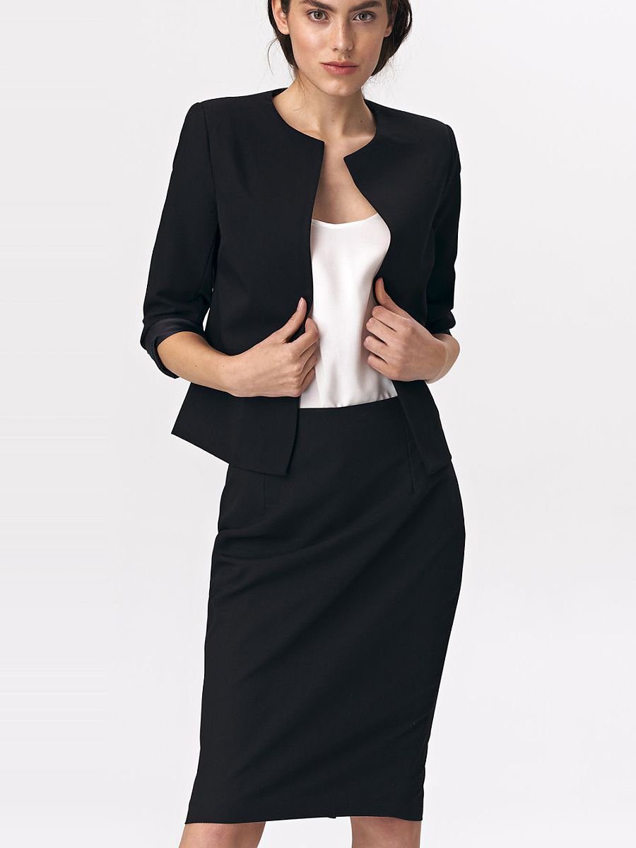 Une veste courte au style classique et simple complétera parfaitement les tenues de bureau décontractées. Grâce à sa forme minimaliste, elle se marie parfaitement avec des jupes à motifs, des chemisiers avec des détails originaux ou des bijoux voyants. Le tissu doux au toucher avec une touche de viscose garantit confort et commodité tout au long de la journée.