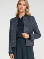 La veste de tailleur pour femme à coupe régulière, courte et de forme carrée est un choix idéal pour les amateurs d’élégance avec une touche de modernité. Fabriqué dans un tissu à la texture chinée et à la couleur non uniforme, il se présente de manière exceptionnelle et ajoute du caractère à chaque tenue. Le modèle sans fermeture se distingue par un design minimaliste, et les épaulettes soulignent délicatement la silhouette, lui donnant une ligne plus nette. Pour un confort optimal et une finition esthétique, la veste est doublée à 100% de polyester. Elle s’intégrera parfaitement dans des tenues élégantes ou décontractées, leur ajoutant une touche de classe subtile et de style mode.