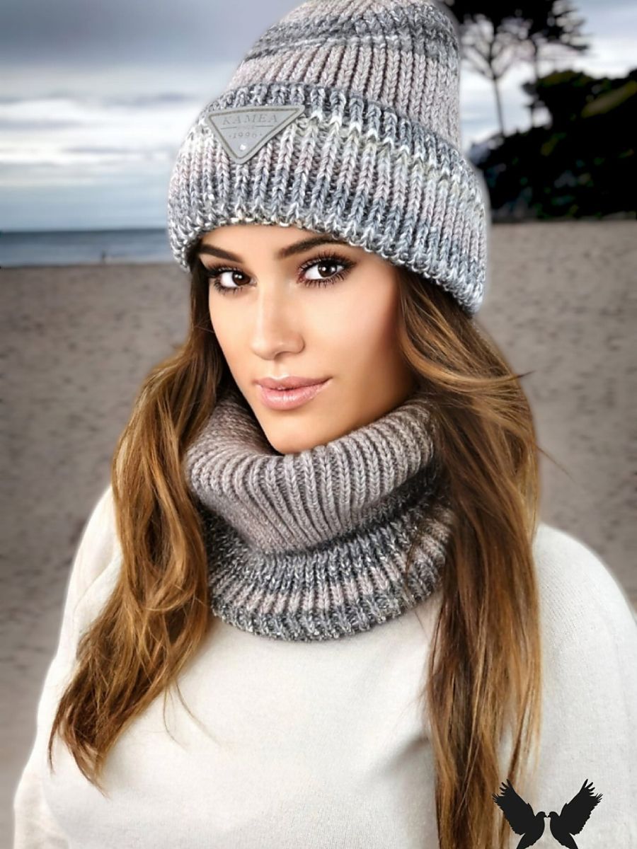 Le bonnet d’hiver pour femmes à rayures avec des paillettes de couleur beige MUSCARI est l’accessoire parfait pour la garde-robe d’hiver. Fabriqué à partir d’un fil de haute qualité avec une touche de laine d’alpaga, il procure chaleur et confort. Un élément supplémentaire qui donne à ce bonnet un caractère unique est les paillettes qui ajoutent de la brillance et de l’élégance. Le large revers sur le front ainsi que le logo décoré de cuir écologique et de paillettes scintillantes mettent en valeur la beauté de la forme. Le bonnet est disponible dans plusieurs variantes de couleurs, ce qui permet de l’adapter à différents styles.