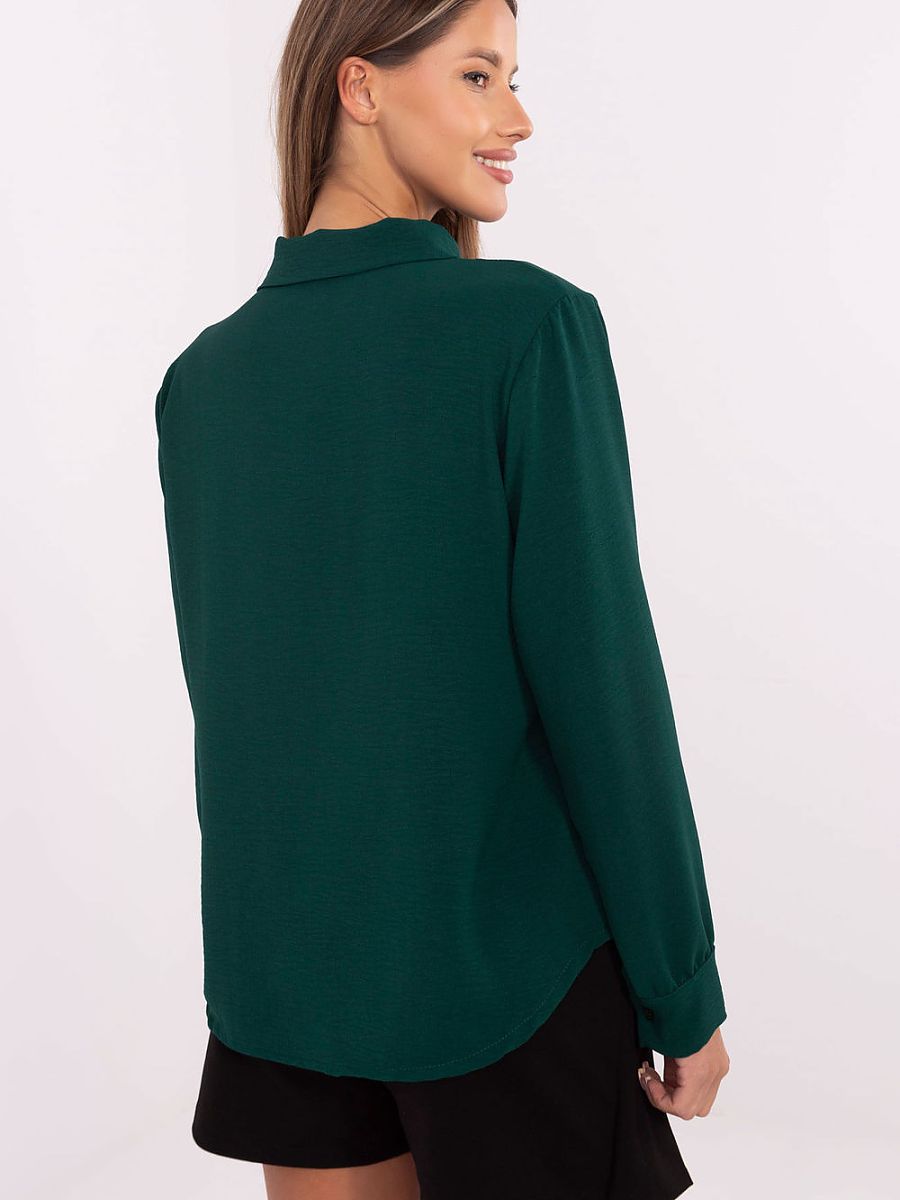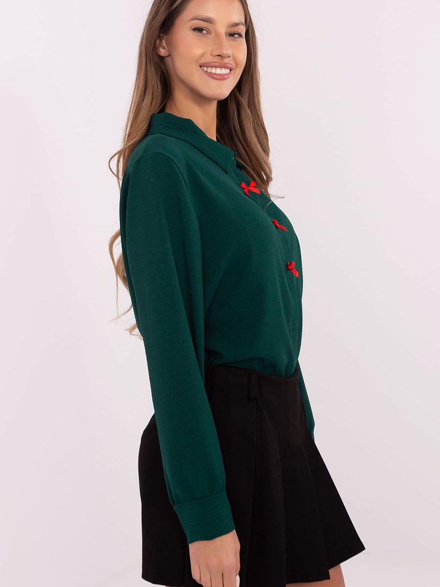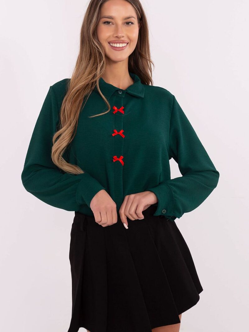Cette élégante chemise pour femme est un choix exceptionnel pour les femmes qui apprécient le style classique avec une touche décorative subtile. Fabriquée à partir d’un mélange lisse de polyester et d’élasthanne, la chemise offre confort, durabilité et une coupe parfaite. La longueur standard et le col classique soulignent la nature polyvalente du modèle. Fermée par des boutons cachés sous la patte de boutonnage, la chemise est exceptionnellement soignée et élégante. Les nœuds décoratifs sur le devant, placés le long de la ligne de boutons, ajoutent un charme sophistiqué, parfaitement adapté à un style élégant. Les manches longues terminées par des poignets complètent le look chic. C’est le choix idéal pour les occasions formelles, le travail ou les sorties en soirée. La chemise se marie bien avec des pantalons élégants, des jupes ou un costume, offrant de nombreuses possibilités de créer des styles uniques qui combinent l’élégance avec une touche d’originalité.