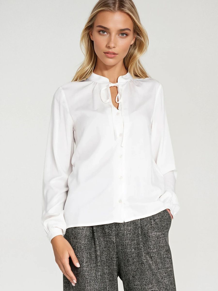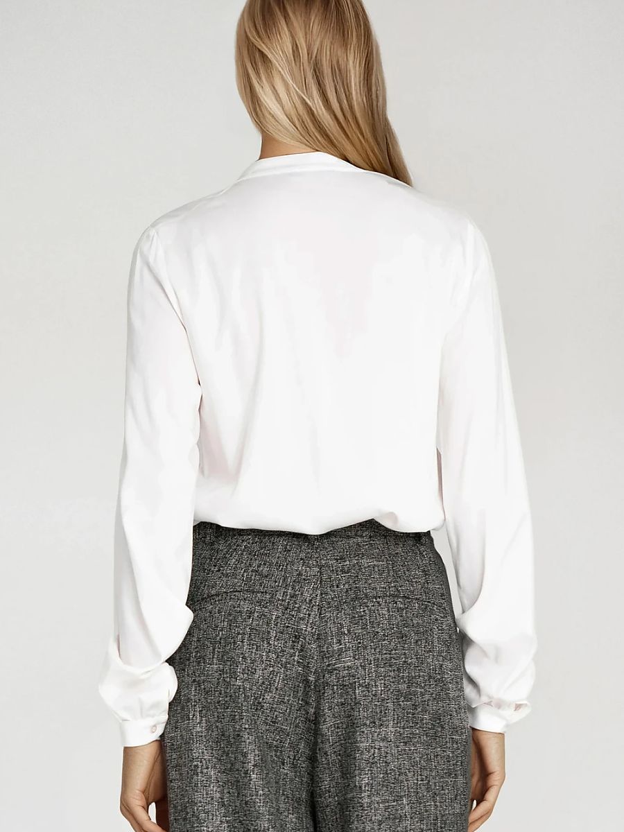 Chemisier élégant pour femme de coupe régulière, fabriqué en viscose légère et aérée. Le modèle est doté d’un nœud sous le cou avec une légère fente au décolleté, ce qui confère à l’ensemble une élégance subtile et un caractère féminin. La chemise a des manches longues et est boutonnée, ce qui permet d’ajuster le style à volonté. De plus, les plis délicats au col ajoutent un détail subtil mettant en valeur le style moderne. Idéal pour le bureau et les occasions décontractées.