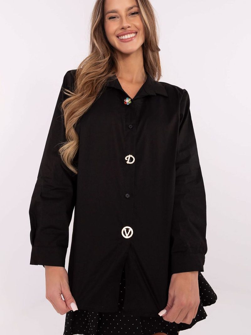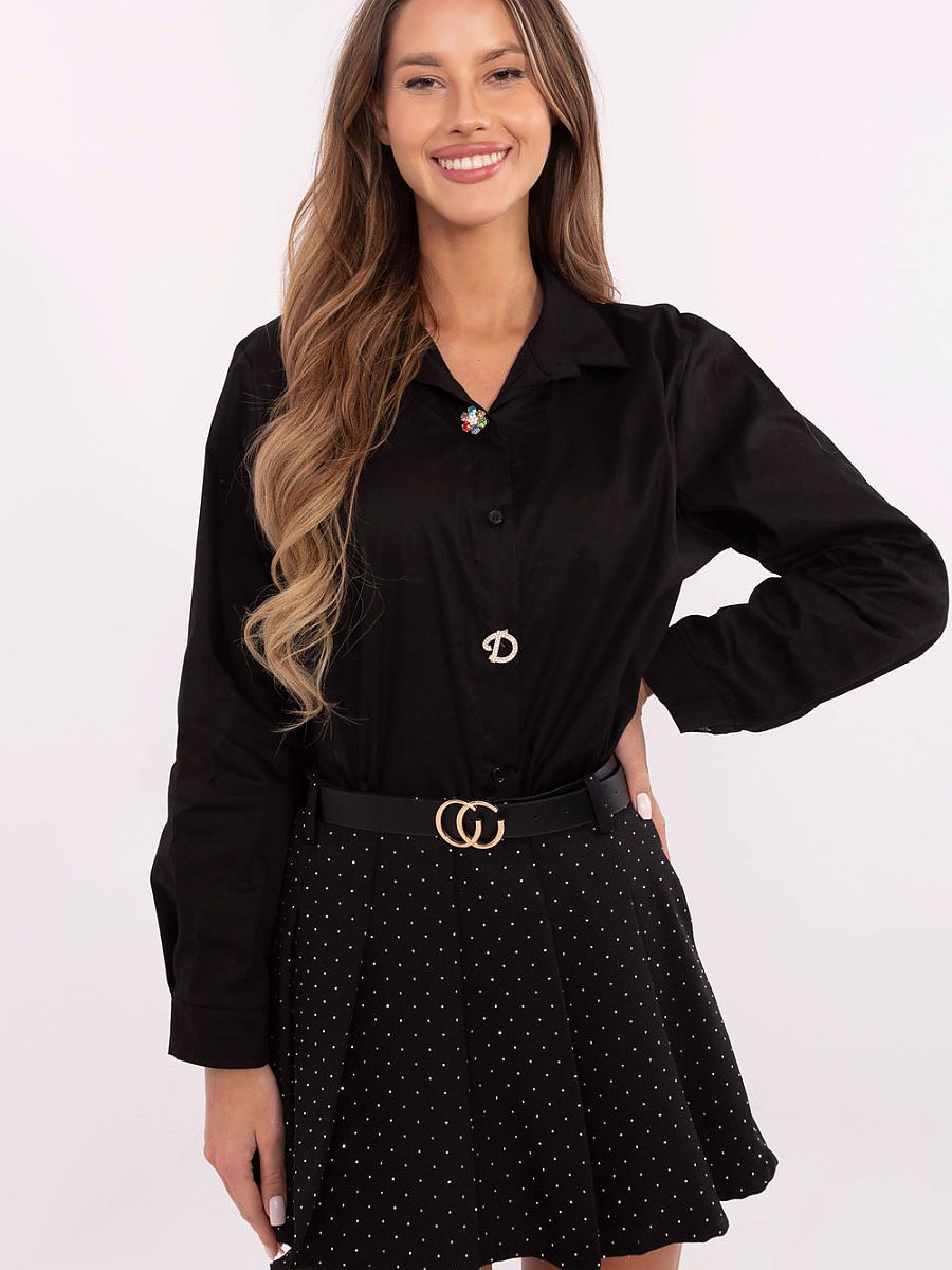 Chemise élégante pour femme de coupe classique, parfaite pour les occasions spéciales, le travail, au quotidien ou pour une soirée. Fabriquée à partir d’un mélange de coton de haute qualité et d’élasthanne, elle assure un confort de port et un ajustement parfait à la silhouette. La chemise a une longueur standard et des manches longues, ce qui en fait un choix polyvalent pour toutes les saisons. Le col classique et la fermeture boutonnée soulignent son caractère intemporel. Un élément exceptionnel sont les broches amovibles, qui permettent de personnaliser la tenue. Ajoutez des broches pour donner de la prestance à la chemise pour des occasions spéciales, ou retirez-les pour un look plus minimaliste et classique. Le tissu lisse et le style élégant font que la chemise convient aussi bien aux tenues formelles qu’aux tenues semi-formelles. C’est un choix parfait pour les femmes qui apprécient la classe et la polyvalence dans leur garde-robe.