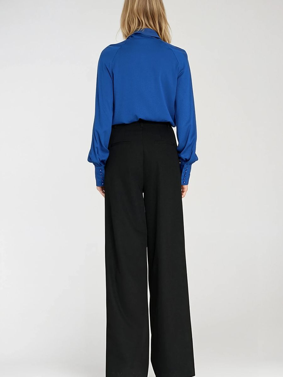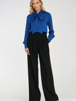 Chemisier élégant pour femme, coupe régulière, fabriqué en viscose délicate et agréable au toucher. Le modèle a une manche longue avec un large poignet orné de boutons décoratifs, ce qui ajoute une élégance subtile à l’ensemble. La chemise est enfilée par la tête et se distingue par un large foulard à nouer librement autour du cou, vous pouvez le nouer en un nœud, le laisser pendre librement ou l’enrouler autour de votre cou, créant ainsi différentes styles. C’est un élément polyvalent de la garde-robe, parfait aussi bien pour le travail que pour des occasions spéciales.