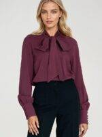 รlรฉgant chemisier pour femme de coupe rรฉguliรจre fabriquรฉ en viscose dรฉlicate et agrรฉable au toucher. Le modรจle a des manches longues terminรฉes par de larges poignets ornรฉs de boutons dรฉcoratifs, ce qui ajoute une รฉlรฉgance subtile ร l’ensemble. Le chemisier s’enfile par la tรชte et se distingue par un large foulard ร nouer librement autour du cou, pouvant รชtre nouรฉ en un nลud, laissรฉ lรขche ou enroulรฉ autour du cou pour crรฉer diffรฉrentes styles. C’est un รฉlรฉment polyvalent de la garde-robe, idรฉal aussi bien pour le travail que pour des occasions spรฉciales.