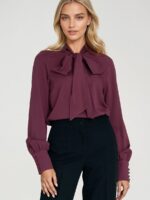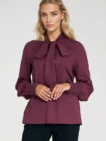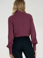 Élégant chemisier pour femme de coupe régulière fabriqué en viscose délicate et agréable au toucher. Le modèle a des manches longues terminées par de larges poignets ornés de boutons décoratifs, ce qui ajoute une élégance subtile à l’ensemble. Le chemisier s’enfile par la tête et se distingue par un large foulard à nouer librement autour du cou, pouvant être noué en un nœud, laissé lâche ou enroulé autour du cou pour créer différentes styles. C’est un élément polyvalent de la garde-robe, idéal aussi bien pour le travail que pour des occasions spéciales.