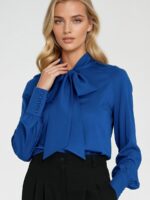 Chemisier élégant pour femme, coupe régulière, fabriqué en viscose délicate et agréable au toucher. Le modèle a une manche longue avec un large poignet orné de boutons décoratifs, ce qui ajoute une élégance subtile à l’ensemble. La chemise est enfilée par la tête et se distingue par un large foulard à nouer librement autour du cou, vous pouvez le nouer en un nœud, le laisser pendre librement ou l’enrouler autour de votre cou, créant ainsi différentes styles. C’est un élément polyvalent de la garde-robe, parfait aussi bien pour le travail que pour des occasions spéciales.