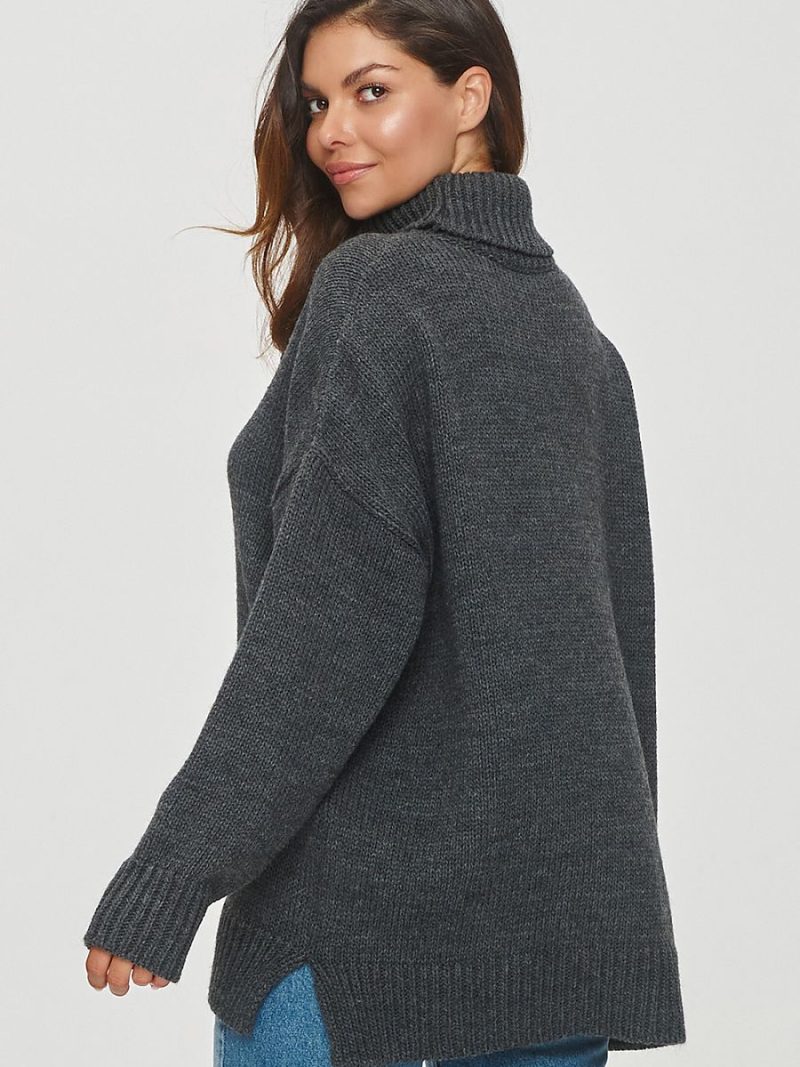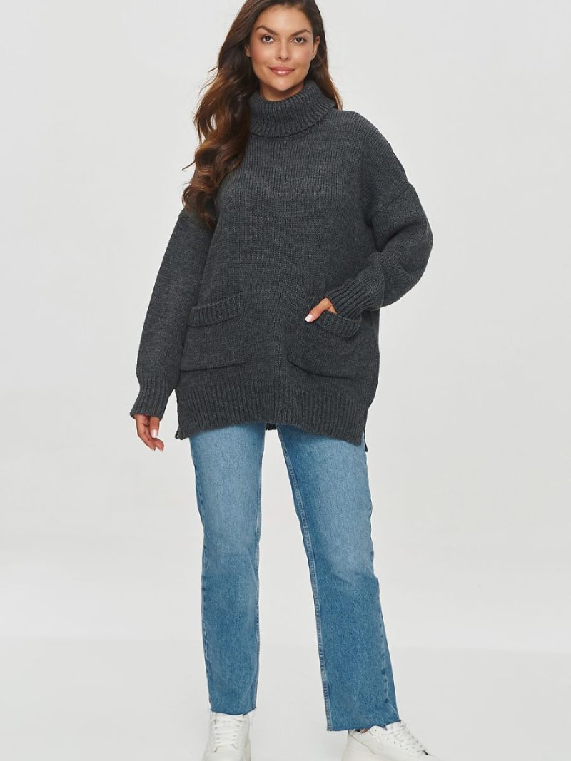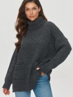 Ce pull pour femmes à la coupe ample est le choix idéal pour les jours les plus froids. Le modèle est doté d’un col roulé permanent, qui vous enveloppera davantage et vous gardera au chaud. La matière est douce et confortable. Le pull a des manches à volants, ce qui accentue encore son caractère décontracté. Deux poches plaquées sur le devant ajoutent à sa fonctionnalité. Le bas du pull et les poignets sont terminés par un passepoil. Ce modèle se distingue par son confort et son originalité. Il s’accorde parfaitement avec un jean ou un legging.
