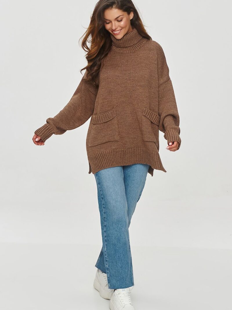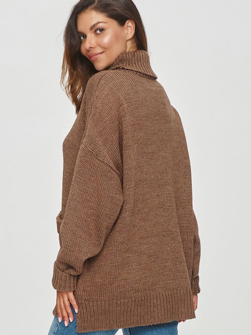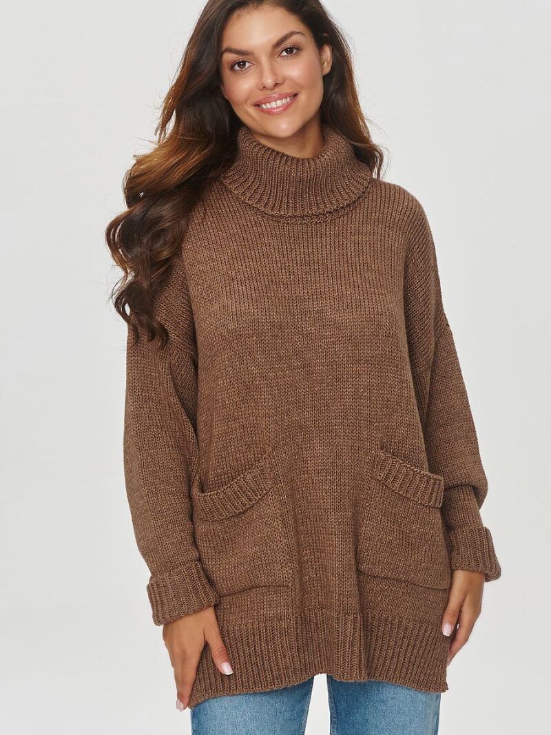 Ce pull pour femmes à la coupe ample est le choix idéal pour les jours les plus froids. Le modèle est doté d’un col roulé permanent, qui vous enveloppera davantage et vous gardera au chaud. La matière est douce et confortable. Le pull a des manches à volants, ce qui accentue encore son caractère décontracté. Deux poches plaquées sur le devant ajoutent à sa fonctionnalité. Le bas du pull et les poignets sont terminés par un passepoil. Ce modèle se distingue par son confort et son originalité. Il s’accorde parfaitement avec un jean ou un legging.