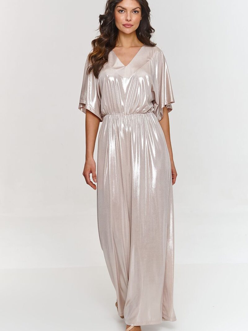 Cette combinaison est un mélange d’élégance et de confort qui attirera sûrement l’attention lors de toute occasion spéciale. Le haut ample avec des manches style kimono lui confère légèreté et liberté. Ce détail rend la tenue exceptionnelle et stylée, tout en ne limitant pas les mouvements. Le décolleté en V est subtil et élégant, mettant parfaitement en valeur le cou et les épaules. Cette coupe de décolleté ajoute de la sensualité et met en valeur la silhouette féminine, tout en conservant un aspect classique et raffiné. Les jambes larges donnent à la combinaison de la légèreté tout en masquant les imperfections de la silhouette et permettent d’allonger la silhouette. La ceinture élastique à la taille garantit un ajustement et met en valeur la silhouette, créant un effet de taille cintrée. Grâce à cela, la combinaison est non seulement élégante, mais aussi confortable toute la journée ou toute la soirée. Le modèle est fabriqué dans un matériau délicat avec une finition métallique, donnant à la tenue un éclat exceptionnel et un caractère moderne. Une combinaison de couleur métallique avec un décolleté en V est une proposition qui vous démarquera de la foule. Sa coupe moderne et son tissu brillant vous feront sentir confiant et stylé à chaque événement. C’est une excellente alternative à la robe, garantissant confort et un look exceptionnel.