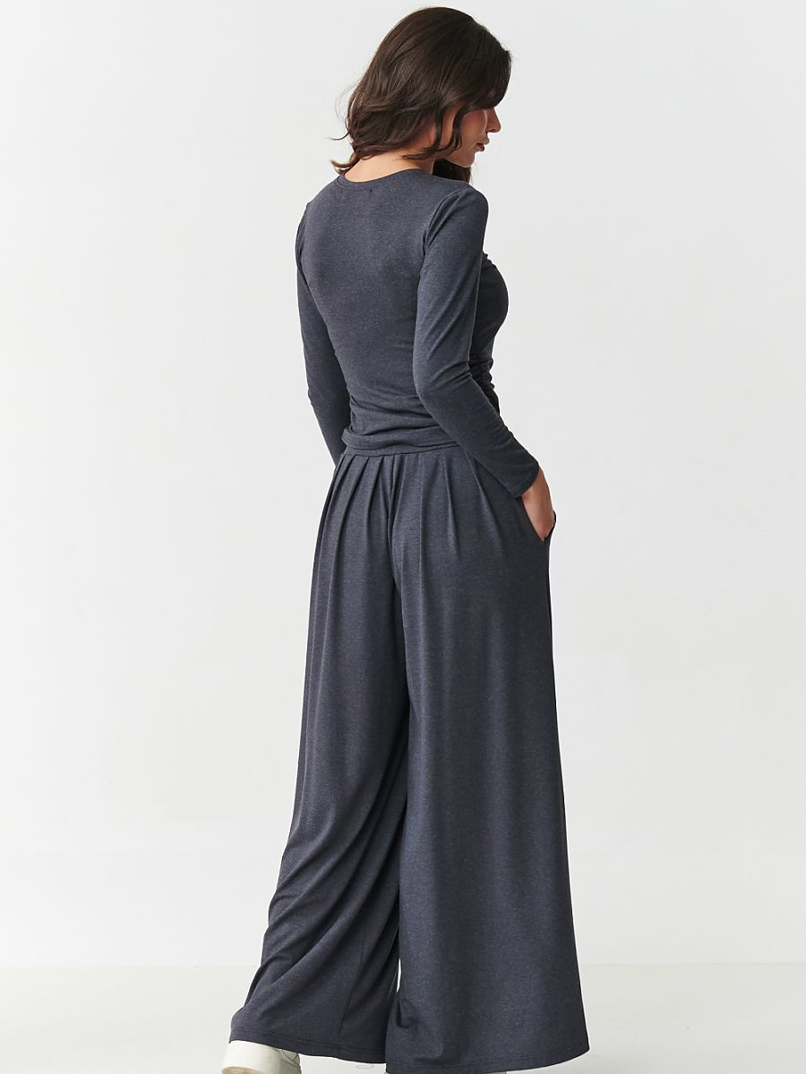 Cet ensemble est une proposition idéale pour les femmes à la recherche d’un mélange de confort, de style et de délicatesse. Fabriqué en viscose douce et agréable au toucher, il s’ajuste parfaitement à la silhouette, offrant une liberté de mouvement et un confort toute la journée. Le haut de l’ensemble est un chemisier ajusté à manches longues, se distinguant par des plis subtils sur les côtés. Ce détail féminin met en valeur la taille tout en donnant à l’ensemble un caractère élégant mais décontracté. Cette combinaison de simplicité et de détail tendance fait que le chemisier convient parfaitement non seulement en tant que partie de l’ensemble, mais aussi seul dans de nombreuses tenues. Les pantalons larges et fluides offrent à la fois confort et style. Grâce à la taille élastique et à la coupe ample, ils sont parfaits pour bouger, et les poches latérales ajoutent une touche de fonctionnalité. C’est le style parfait à porter à la maison ou dans des tenues de rue. Cet ensemble féminin est disponible dans des couleurs tendance et universelles : anthracite, noir, chocolat, kaki et bordeaux. Optez pour le confort qui s’accorde avec l’élégance féminine en choisissant un ensemble en viscose qui s’adaptera à votre style de vie et votre silhouette.