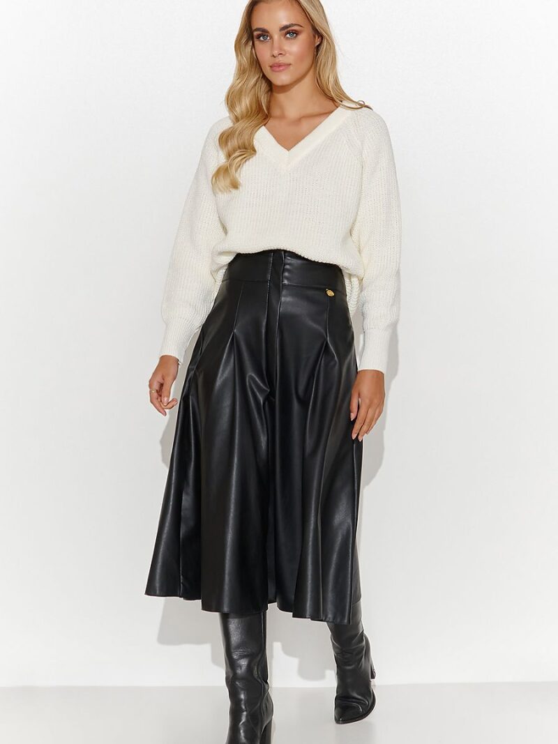 La jupe midi exclusive en cuir est le complément parfait de votre garde-robe. La fente moderne située au milieu ajoute une touche sensuelle, tandis que la plaque dorée décorative est un élément de bijouterie subtil. Grâce à l’épaisse ceinture placée sur la ligne de taille, la jupe souligne la silhouette féminine, et la longueur midi lui confère classe et élégance. Elle s’associe parfaitement avec des bottes ou des bottines, créant un style pour une variété d’occasions, d’une soirée en ville à des réunions d’affaires. La couleur noire classique permet d’assortir la jupe à de nombreux hauts et chemisiers, ce qui offre d’innombrables possibilités de créer des looks uniques.