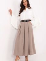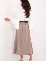 Jupe longue évasée élégante et féminine avec des volants sur le devant, alliant confort et style classique adapté aussi bien au travail qu’aux sorties quotidiennes. Fabriquée en un mélange de viscose et de polyester de haute qualité, elle est légère, aérée et épouse parfaitement la silhouette. Le modèle a une taille élastique à l’arrière pour un ajustement parfait à la taille, ainsi qu’une ceinture à nouer pour mettre en valeur la silhouette de manière subtile. Les poches latérales ajoutent une touche de fonctionnalité, tandis que les volants à l’avant donnent à la jupe une forme élégante et évasée. La jupe a un motif lisse, pas de fermeture classique et une longueur maxi, ce qui la rend polyvalente et facile à styliser. C’est une proposition idéale pour les occasions quotidiennes, festives et élégantes, alliant confort et coupe intemporelle.