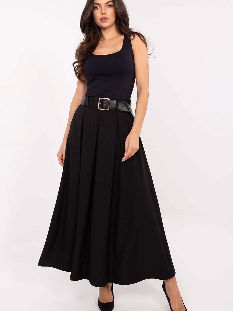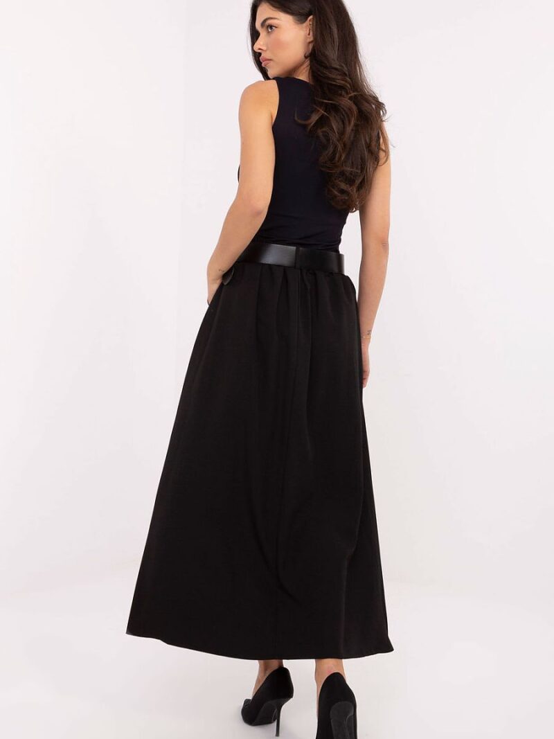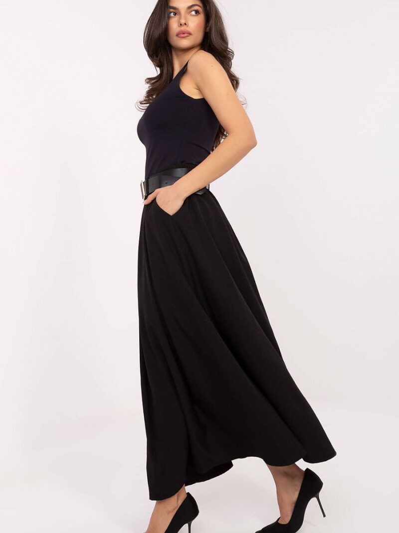 Jupe longue évasée maxi élégante et féminine avec des contre-plis sur le devant, alliant confort et style classique adapté aussi bien au travail qu’aux sorties quotidiennes. Fabriquée à partir d’un mélange de viscose et de polyester de haute qualité, elle est légère, aérée et épouse parfaitement la silhouette. Le modèle a une bande élastique à l’arrière pour un ajustement parfait à la taille, ainsi qu’une ceinture fermée permettant de subtilement souligner la silhouette. Les poches latérales insérées ajoutent de la fonctionnalité, tandis que les contre-plis à l’avant donnent à la jupe une forme élégante et évasée. La jupe a un motif lisse, pas de fermeture classique et une longueur maxi, ce qui la rend polyvalente et facile à styliser. C’est une proposition idéale pour les occasions quotidiennes, les sorties et les événements élégants, alliant confort et coupe intemporelle.