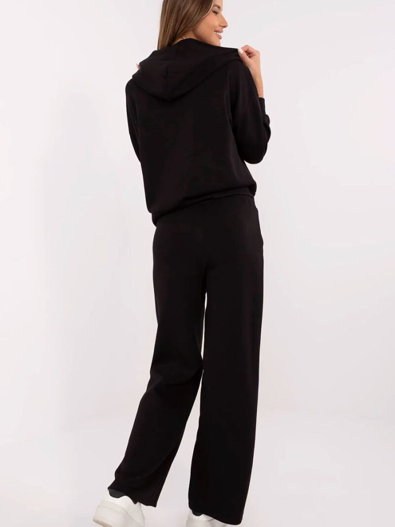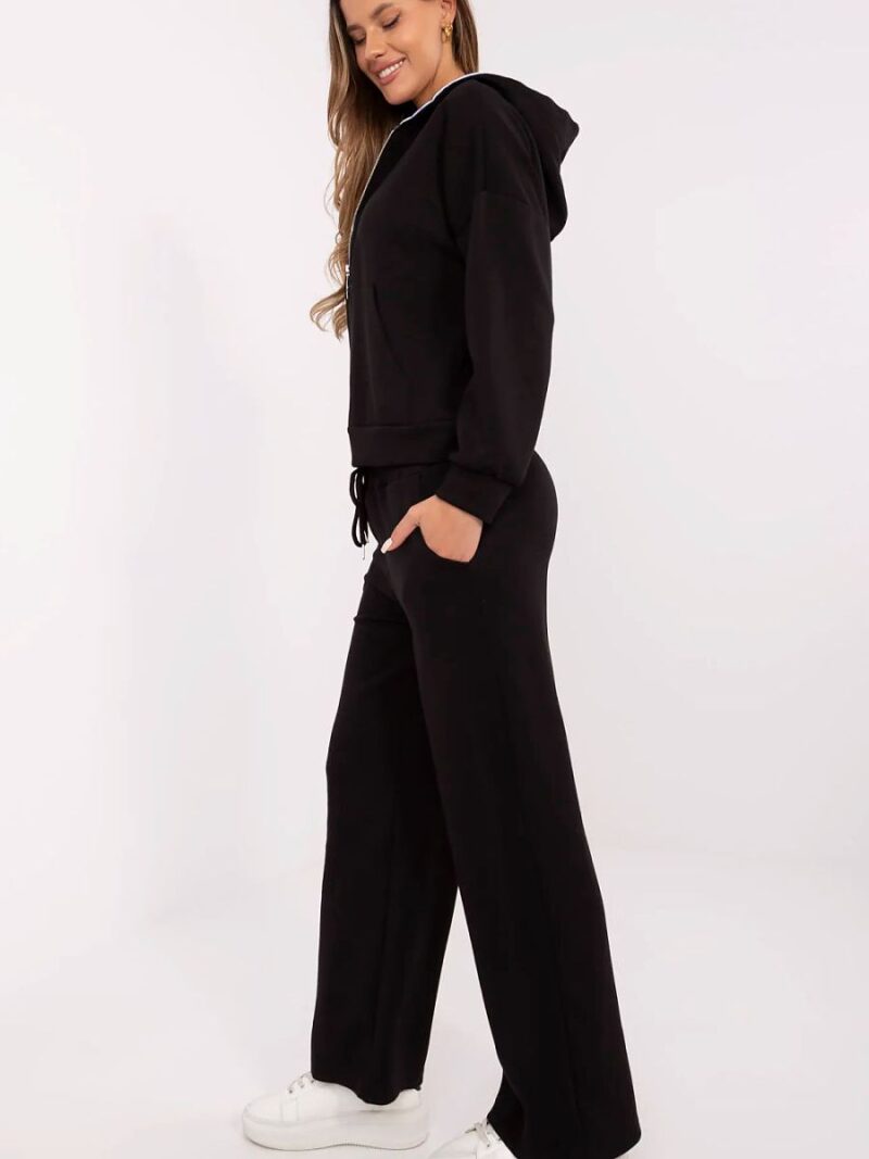 Ensemble de survêtement pour femme alliant confort et style dans des tenues quotidiennes. Fabriqué à partir d’un mélange de haute qualité de viscose, coton et élasthanne, il assure douceur, respirabilité et un ajustement parfait à la silhouette. Le sweat à capuche à manches longues, avec fermeture à glissière, possède une capuche pratique et des poches insérées, ce qui lui confère une fonctionnalité. Le pantalon à coupe droite et taille haute garantit un confort de port, tandis que les cordons à la taille permettent d’ajuster l’ajustement. Grâce à sa structure lisse et à son design minimaliste, cet ensemble conviendra parfaitement au quotidien, que ce soit à la maison, en promenade ou en faisant des achats.