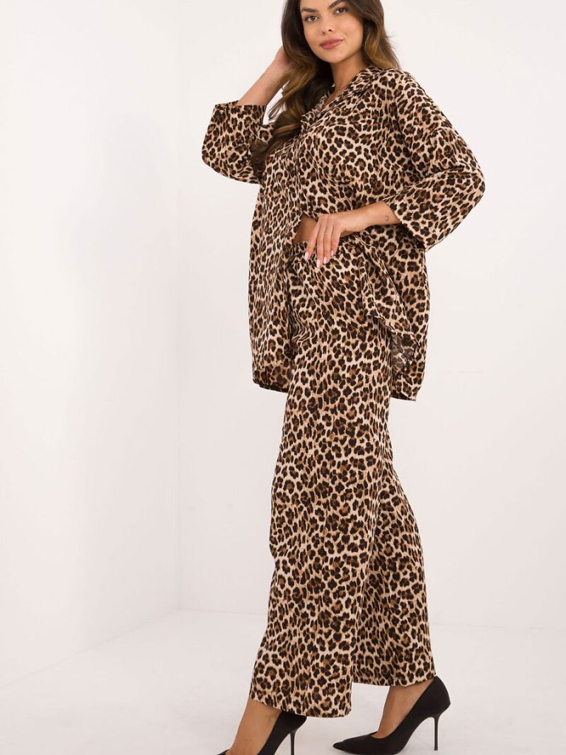 Ensemble composé d’une chemise et d’un pantalon, idéal pour les occasions quotidiennes décontractées. La chemise est boutonnée, avec des manches 3/4 et un col classique, ce qui lui confère un caractère universel. Un avantage supplémentaire est la poche pratique au niveau de la poitrine. Les pantalons ont des jambes larges, ce qui assure confort et liberté de mouvement, et grâce à une ceinture élastique, ils s’adaptent parfaitement à la silhouette, offrant un confort de port toute la journée. L’ensemble est fabriqué à partir d’un mélange de polyester et d’élasthanne, garantissant légèreté, élasticité et durabilité du matériau. Le motif animalier domine, ajoutant une touche de mode et d’expression à l’ensemble. La chemise et le pantalon sont longs, et le pantalon a une taille haute, soulignant la silhouette et ajoutant de l’élégance aux tenues décontractées quotidiennes.