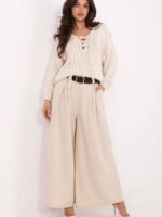 Pantalons palazzo élégants et confortables pour femmes, fabriqués à partir d’un mélange de viscose et de polyester de haute qualité, alliant élégance et confort au quotidien et au travail. Le tissu lisse confère aux pantalons un caractère classique et raffiné, tandis que les jambes longues et larges allongent optiquement la silhouette, créant un look léger et féminin. Le modèle a une taille haute avec une bande élastique pour un ajustement parfait et des plis sur le devant qui soulignent subtilement la taille. Un avantage supplémentaire est la ceinture à boutonnière, permettant d’ajuster les pantalons à la silhouette et d’ajouter une touche raffinée à la tenue. Il s’agit d’une proposition polyvalente qui conviendra parfaitement aux tenues décontractées du quotidien, ainsi qu’aux tenues élégantes pour le travail ou les occasions spéciales.