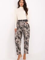 Pantalons pour femmes en tissu de style décontracté, parfaits pour tous les jours. Fabriqués à partir d’un mélange de viscose, de polyester et d’élasthanne, alliant confort, élasticité et durabilité. Le modèle à taille haute, aux jambes fuselées et à la taille élastique offre un grand confort, tandis que la ceinture souligne la taille. Les poches latérales et le motif à la mode de camouflage sur toute la matière confèrent aux pantalons un caractère moderne et prononcé.