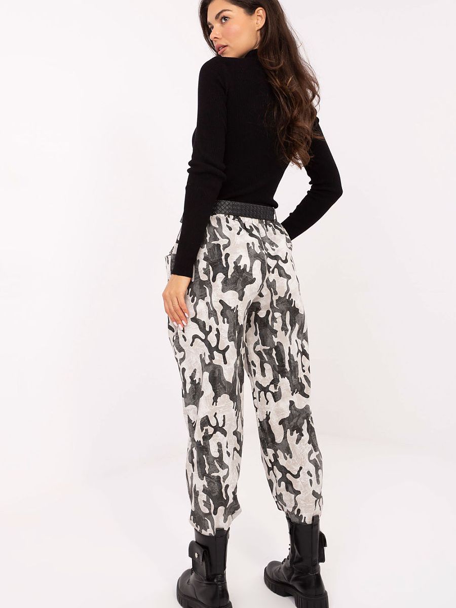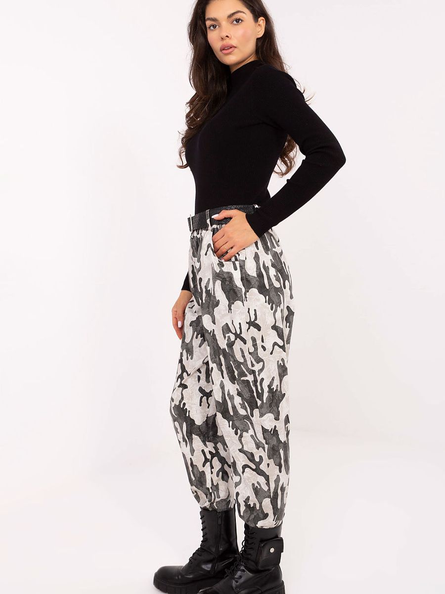 Pantalons pour femmes en tissu de style décontracté, parfaits pour tous les jours. Fabriqués à partir d’un mélange de viscose, de polyester et d’élasthanne, ils allient confort, élasticité et durabilité. Le modèle à taille haute, aux jambes fuselées et à la taille élastique assure un confort de port, tandis que la ceinture à boucle souligne la taille. Les poches latérales et le motif camouflage à travers tout le tissu confèrent aux pantalons un caractère moderne et audacieux.