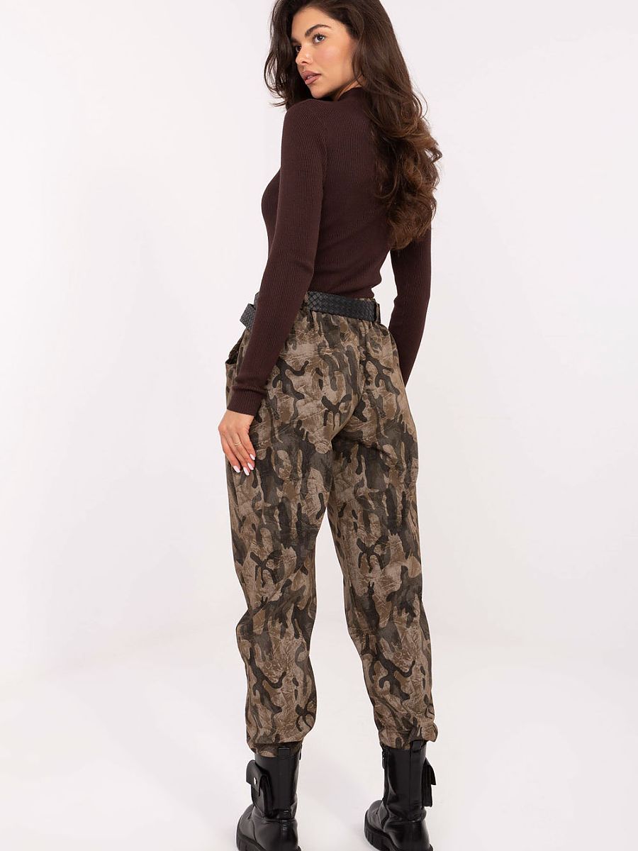 Pantalon femme en tissu style décontracté, parfait pour tous les jours. Fabriqué à partir d’un mélange de viscose, de polyester et d’élasthanne, alliant confort, élasticité et durabilité. Modèle taille haute, jambes fuselées et taille élastique pour un confort optimal, avec une ceinture à boucle pour souligner la taille. Poches latérales et motif camouflage moderne sur l’ensemble du tissu donnent au pantalon un caractère moderne et distinctif.