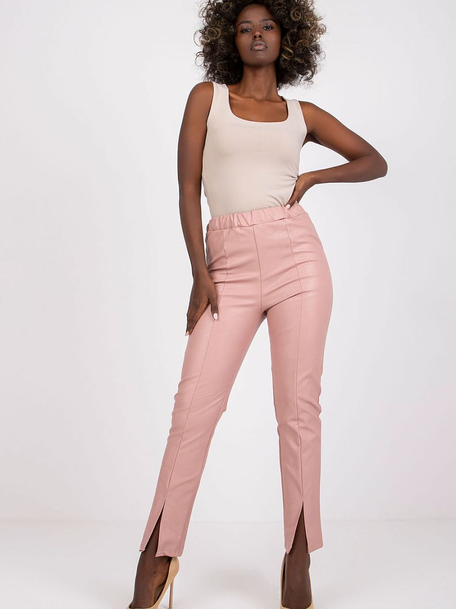 Pantalon pour femme en cuir écologique, taille haute, ceinture élastique. Jambes avec fentes.