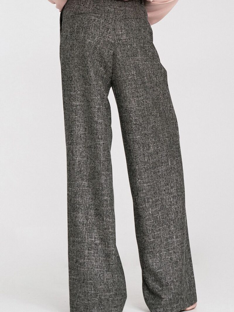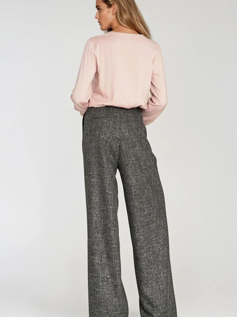 Pantalon élégant pour femme de coupe relaxed fit, fabriqué dans un tissu à texture chinée et couleur irrégulière, leur donnant un aspect moderne et stylé. Le modèle présente une taille haute et des plis décoratifs à l’avant, soulignant subtilement la silhouette. Les jambes larges sont larges et longues, offrant confort et liberté de mouvement. Le pantalon se ferme à l’avant avec une fermeture éclair et un bouton, des poches classiques à l’avant et des fausses poches à l’arrière. Les passants de ceinture permettent un ajustement supplémentaire de la tenue. Parfait pour des tenues décontractées et élégantes, alliant confort et design tendance.