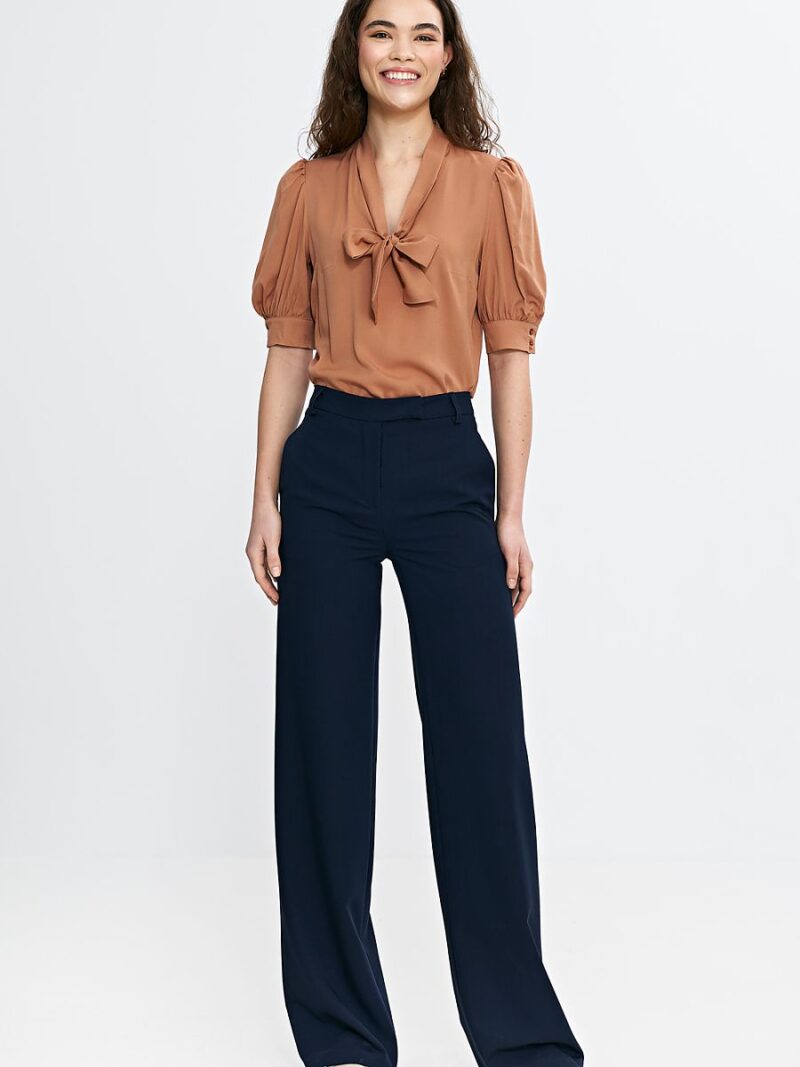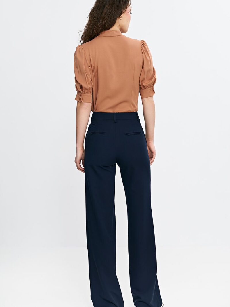 Pantalon de femme ajusté, taillé pour épouser la silhouette, mettant en valeur subtilement la figure. La taille haute leur donne un aspect élégant et affiné, tandis que la jambe de type bootcut s’élargit légèrement à partir du genou, créant un effet de silhouette proportionnée. La fermeture à glissière et le bouton caché par un pli assurent confort et élégance. Les poches latérales classiques et les fausses poches arrière ajoutent de la fonctionnalité, tandis que les passants de ceinture permettent un ajustement supplémentaire. Parfait pour le bureau et les sorties plus décontractées.