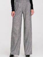 Pantalon élégant pour femme de coupe relaxed fit, fabriqué dans un tissu à la texture chinée et à la couleur non uniforme qui leur donne un caractère moderne. Le modèle a une taille haute et des plis décoratifs à l’avant, soulignant subtilement la silhouette. Les jambes larges sont larges et longues, offrant confort et liberté de mouvement. Les pantalons ont des poches classiques à l’avant et la partie arrière de la taille est équipée d’un élastique pour ajuster les pantalons à la silhouette. Un détail supplémentaire est la large ceinture avec des boutons décoratifs, donnant à l’ensemble un caractère élégant et à la mode.