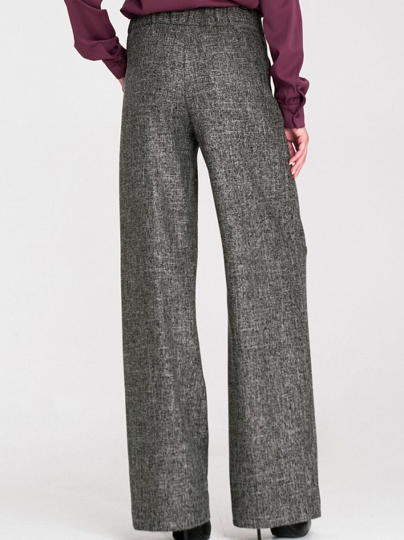 Pantalons pour femmes de coupe relaxed fit, fabriqués dans un tissu avec une texture chinée et une couleur irrégulière qui leur donne un caractère moderne. Le modèle a une taille haute et des plis décoratifs à l’avant, soulignant subtilement la silhouette. Les jambes larges et longues offrent confort et liberté de mouvement. Les pantalons ont des poches classiques à l’avant et la partie arrière de la taille est équipée d’un élastique qui ajuste les pantalons à la silhouette. Un détail supplémentaire est la large ceinture avec des boutons décoratifs, ajoutant un caractère élégant et mode à l’ensemble.