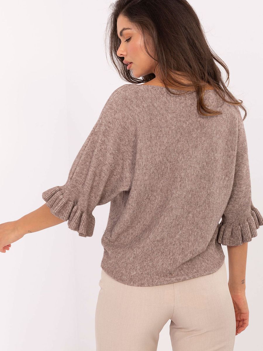 Un élégant pull pour femme de longueur standard, idéal à la fois pour tous les jours et pour des occasions plus spéciales. Fabriqué à partir d’un mélange de viscose, de polyester et de nylon de haute qualité, il assure un grand confort et une grande durabilité. Son motif lisse lui confère un caractère intemporel, tandis que les détails subtils ajoutent du charme féminin. Ce modèle se distingue par son encolure ronde et ses manches 3/4 ornées d’une délicate volant, soulignant l’élégance et la légèreté de la tenue. Un choix parfait pour les femmes qui apprécient la classique dans une présentation moderne.