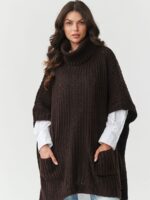 Découvrez un poncho unique pour femme qui allie un design à la mode et un confort inégalé. Une coupe oversize ample avec des manches jusqu’au coude et un col haut et ample enveloppe la silhouette, ajoutant du style et assurant une chaleur même lors des journées plus fraîches. Les grandes poches pratiques à l’avant lui donnent un caractère décontracté et le rendent parfait pour une tenue de tous les jours ainsi que pour des styles plus élégants. De plus, les manches et le bas sont finis avec une bordure étroite. Le pull est fabriqué à partir d’un mélange de fibres de haute qualité : acrylique, polyester, laine et polyamide, ce qui le rend doux, agréable au toucher, durable et résistant à la déformation. La texture épaisse et structurée souligne son caractère unique, en faisant un choix idéal pour l’automne et l’hiver. Disponible dans des couleurs intemporelles et à la mode : beige chiné – un classique qui va avec tout, vert bouteille – profond et élégant, chocolat – une nuance chaude et sensuelle, gris chiné – moderne et polyvalent. Si vous recherchez un pull à la fois pratique et stylé, ce modèle est parfait. Il se marie parfaitement avec des jeans, des leggings ou une chemise classique, créant des styles superposés spectaculaires. Optez pour la chaleur, le confort et l’élégance intemporelle, choisissez un pull poncho avec col haut et poches, qui deviendra rapidement votre pièce préférée de votre garde-robe d’automne-hiver.