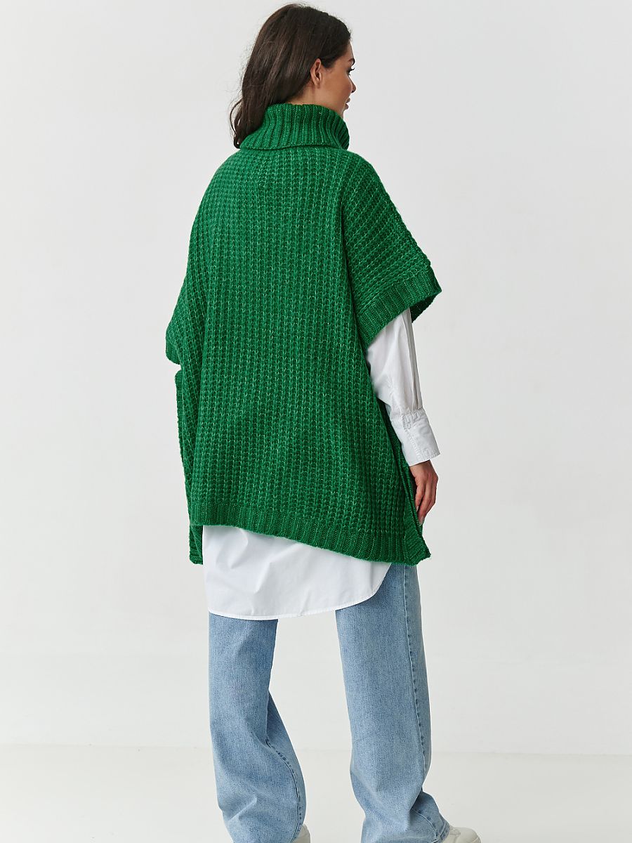 Découvrez un pull-over unique pour femme sous forme de poncho, qui allie un design à la mode et un confort inégalé. Coupe oversize décontractée avec des manches jusqu’au coude et un col roulé haut et ample qui enveloppe la silhouette, ajoutant du style et assurant la chaleur même les jours les plus froids. Les grandes poches pratiques à l’avant lui confèrent un caractère décontracté et lui permettent de s’adapter parfaitement aussi bien au quotidien qu’à des tenues plus élégantes. De plus, les manches et le bas sont finis par une bande étroite. Le pull est fabriqué à partir d’un mélange de fibres de haute qualité : acrylique, polyester, laine et polyamide, ce qui le rend doux, agréable au toucher, tout en étant durable et résistant à la déformation. Le motif texturé plus épais souligne son caractère unique, en faisant le choix parfait pour l’automne et l’hiver. Disponible dans des couleurs intemporelles et tendance : mélange de beige – un classique qui va avec tout, vert bouteille – profond et élégant, chocolat – une teinte chaleureuse et sensuelle, mélange de gris – moderne et polyvalent. Si vous cherchez un pull à la fois pratique et stylé, ce modèle est parfait. Il se marie parfaitement avec des jeans, des leggings ou une chemise classique, créant des styles superposés spectaculaires. Optez pour la chaleur, le confort et l’élégance intemporelle, choisissez un poncho avec col roulé et poches, qui deviendra rapidement votre pièce préférée de votre garde-robe automne-hiver.