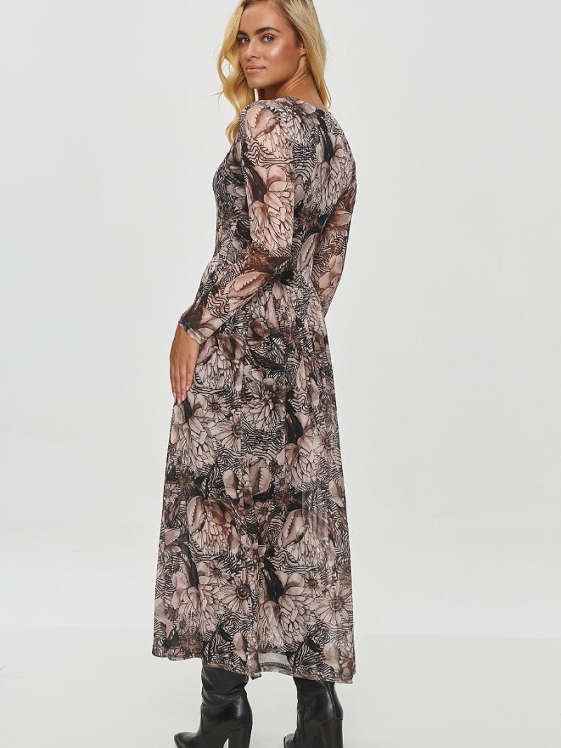 Une longue robe imprimée faite d’un matériau léger et aérien qui lui donne un look élégant et romantique. Le motif de la robe est un mélange complexe de motifs végétaux, animaux et abstraits, dans des couleurs dominantes de noir, blanc, beige, brun et nuances d’orange. Le motif est compliqué et original, ajoutant une touche de style prononcée à la création. Le haut du modèle est légèrement ajusté, soulignant la taille, tandis que le bas est évasé, ajoutant légèreté et mouvement. La finition de la robe est subtile et le matériau est semi-transparent, soulignant sa délicatesse. La robe a une doublure en viscose qui couvre discrètement les zones stratégiques et assure un confort lors de son port. Associée à des bottines lourdes, elle crée un contraste avec la délicatesse de la robe, donnant un aspect plus décontracté à l’ensemble. La robe est parfaite pour les soirées d’automne ou d’hiver, grâce à ses couleurs chaudes et à ses manches longues. La création est disponible en cinq variantes, différant par la couleur et le motif.