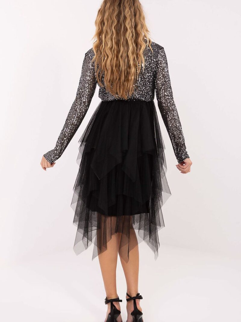 Une élégante robe évasée au-dessus du genou, conçue pour des occasions spéciales et des sorties élégantes en soirée. Fabriquée dans un mélange de polyester et d’élasthanne, elle offre un grand confort et s’adapte parfaitement à la silhouette. Le haut de la robe est orné de sequins spectaculaires qui brillent magnifiquement et ajoutent de l’élégance à l’ensemble. Le décolleté cache-cœur met en valeur la ligne féminine du cou et confère au projet un caractère sensuel et élégant. Les manches longues ajoutent une classe intemporelle et de la subtilité. La jupe évasée en tulle apporte légèreté et un effet romantique, se déployant magnifiquement en mouvement. Le modèle est doublé pour plus de confort et garantit un ajustement parfait du tissu. La robe n’a pas de fermeture, ce qui assure un grand confort et une fluidité des formes. C’est une proposition exceptionnelle pour les femmes qui souhaitent combiner élégance, éclat et légèreté dans une seule et élégante tenue.