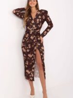 La robe crayon élégante est le choix idéal pour des occasions spéciales. Fabriquée dans un mélange agréable au toucher de viscose et de polyester, elle s’ajuste magnifiquement à la silhouette, mettant en valeur les formes féminines. Le modèle a une longueur midi et des manches longues, ce qui lui donne classe et élégance. À l’avant, il y a une fente spectaculaire qui atteint la cuisse, ce qui met subtilement en valeur la jambe, ajoutant un caractère sensuel à l’ensemble. Le décolleté croisé affine visuellement le cou et souligne le décolleté, tandis que les plis décoratifs avec une décoration en métal constituent un accent élégant qui attire le regard. La robe à motif floral sera parfaite pour les fêtes, les réceptions et les occasions habillées, alliant féminité, chic et confort en un seul.