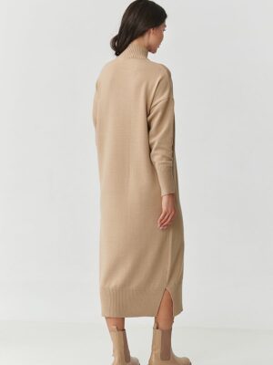 Si vous voulez que vos vêtements vous rendent plus mince, choisissez des coupes plus longues. Vous soulignerez votre silhouette féminine et vous vous sentirez à l’aise en même temps. Notre proposition comporte un col roulé avec un pli et des manches longues. Le bas de la robe, grâce aux plis à la taille et aux fentes sur les côtés, est léger et aéré. Bien que le modèle soit simple dans sa forme, il se distingue par un minimalisme de bon goût. Cette robe ne se démodera jamais. Il combine les tendances avec les classiques intemporels. Il est extrêmement fonctionnel et vous permet de créer de nombreuses tenues différentes. Vous pouvez porter n’importe quel type de chaussures, de sac et le combiner avec des bijoux tels qu’un long collier. Ce ne sera certainement pas ennuyeux !