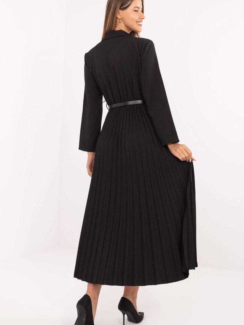 Une élégante robe maxi à la coupe évasée, parfaite à la fois pour le travail et les occasions spéciales. Le haut de style marin avec un col classique et une fermeture à bouton apporte une touche d’élégance et de caractère professionnel à l’ensemble. De la taille vers le bas, la robe est faite d’un tissu plissé qui se pose magnifiquement en mouvement, soulignant la légèreté et le charme féminin. Les manches longues ajoutent de l’élégance, et la ceinture amovible souligne la taille et donne à la silhouette des proportions. L’ensemble est fini avec une texture lisse, et le mélange dominant de viscose et de polyester assure un confort de port et une durabilité du matériau.