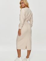 La robe en sweat est une création décontractée de longueur midi, parfaite pour tous les jours. Elle a une coupe ample dans la partie supérieure et des manches longues de type raglan soulignant son caractère décontracté et sportif. Le col est arrondi, simple et subtil, ce qui convient au style général minimaliste de la robe. À la taille, il y a une large ceinture élastique qui met en valeur la silhouette, ajoutant une touche féminine à cette coupe simple. Le bas de la robe est droit, crayon, atteignant le genou. Cette coupe assure confort et met en valeur la silhouette féminine. Il y a des poches pratiques sur les côtés, ce qui la rend fonctionnelle et confortable. La robe est polyvalente et confortable, parfaite pour les sorties quotidiennes. Elle associe une décontraction sportive à un minimalisme élégant, ce qui en fait un choix idéal pour différentes occasions, que ce soit pour le travail ou pour des rencontres sociales.