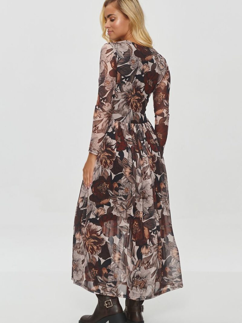 Une longue robe imprimée faite d’un tissu léger et aérien qui lui donne un look élégant et romantique. Le motif de la robe est un mélange complexe de motifs végétaux, animaliers et abstraits, dans des couleurs dominantes de noir, blanc, beige, brun et nuances d’orange. Le motif est compliqué et original, ajoutant un style distinctif à la création. Le modèle a un haut légèrement ajusté qui met en valeur la taille, tandis que le bas est évasé, ajoutant de la légèreté et du mouvement. La finition de la robe est subtile, et le tissu est semi-transparent, soulignant sa délicatesse. La robe a une doublure en viscose qui couvre discrètement les zones stratégiques et assure un confort lors de son port. Associée à des bottines lourdes, elle crée un contraste avec la délicatesse de la robe, ajoutant un look plus décontracté. La robe est parfaite pour les soirées d’automne ou d’hiver, grâce à ses couleurs chaudes et ses manches longues. La création est disponible en cinq variantes, différenciées par couleur et motif.
