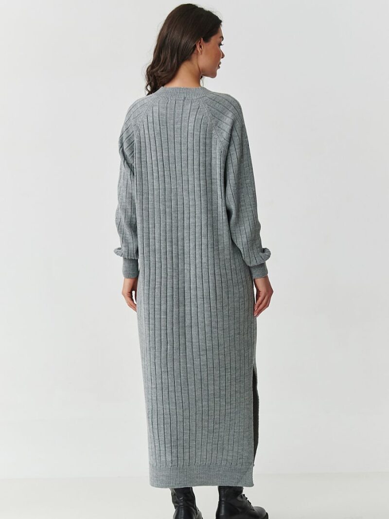 Misez sur une élégance exceptionnelle et un confort maximal ! Cette longue robe pull à motif côtelé est une proposition idéale pour les jours plus frais, alliant style intemporel et confort dans lequel vous vous sentirez féminine et à la mode. Fabriquée à 100 % en acrylique de haute qualité, elle est douce, agréable au toucher et facile à entretenir. Sa coupe ample avec un décolleté en V met joliment en valeur la silhouette, tandis que les fentes pratiques sur les côtés ajoutent de la légèreté et de la liberté de mouvement. La robe se marie parfaitement avec des bottines élégantes ou des chaussures plus lourdes de style militaire, créant des tenues allant du décontracté au plus audacieux. Disponible dans plusieurs couleurs neutres : noir, cappuccino, chocolat, gris anthracite chiné et gris chiné, vous pourrez facilement choisir la teinte idéale pour votre style. Cette robe conviendra aussi bien pour le quotidien, le travail que pour les soirées, vous aurez toujours un look à la mode et féminin.