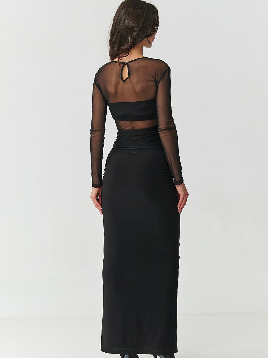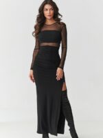 Entrez dans le monde de l’élégance qui hypnotise dès le premier regard. Cette robe noire maxi en résille est une proposition pour les femmes qui n’ont pas peur de briller et qui veulent se sentir absolument spéciales. La coupe ajustée souligne parfaitement la silhouette, et les plis subtils à la taille modèlent la figure, lui donnant une légèreté sensuelle. Le haut transparent en résille délicate confère à la robe un caractère mystérieux où l’élégance rencontre le courage. De plus, sous le tulle se trouve un top indépendant que vous pouvez utiliser pour d’autres styles. La fente sensuelle dévoile la jambe à chaque pas, ajoutant un magnétisme féminin à l’ensemble. Le bouton doré à l’arrière remplit non seulement une fonction pratique, mais lui confère également un caractère bijoutier, contrastant magnifiquement avec le noir profond du matériau. Cet accent subtil confère à la robe un aspect luxueux, tout en la rendant unique dans les moindres détails. Ce n’est pas une simple robe de soirée, c’est une création dans laquelle vous sentirez que tous les regards sont tournés vers vous. Parfaite pour un mariage, un bal, une remise de diplôme ou un dîner élégant, elle vous fera toujours vous démarquer par votre style et votre confiance en vous. Audacieuse, hypnotisante, parfaite pour une femme qui veut laisser une impression éblouissante et mémorable, tout comme la robe elle-même.