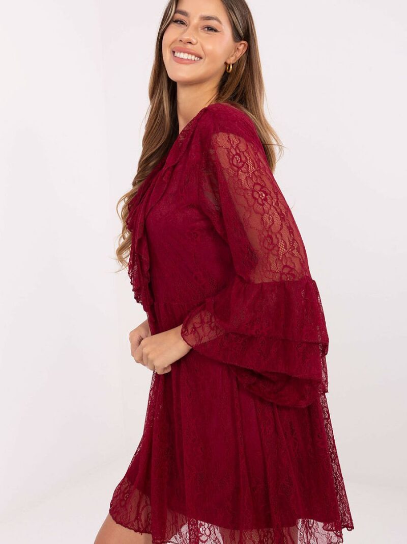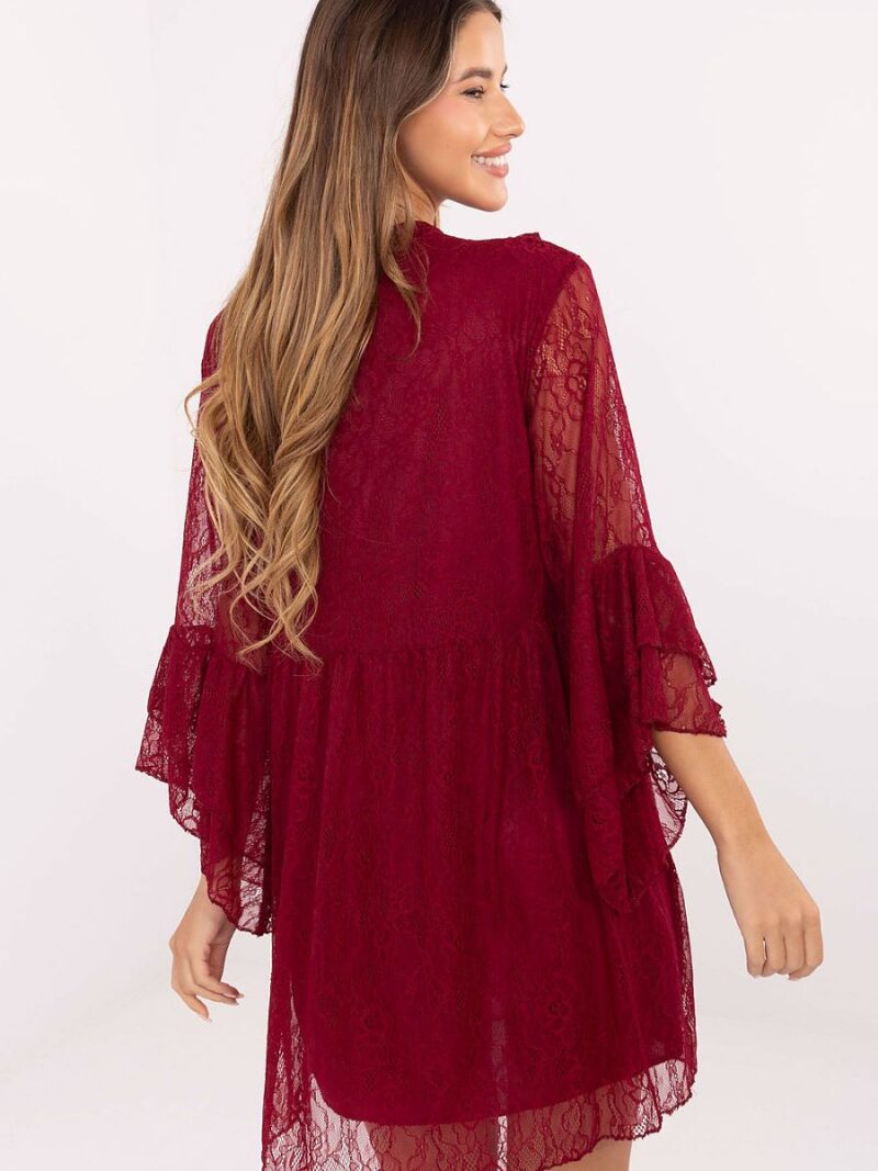La magnifique robe en dentelle évasée est une proposition qui mettra en valeur la féminité et ajoutera du charme à chaque tenue. Fabriquée en dentelle délicate avec un motif ajouré et ajout de nylon et d’élasthanne, elle s’ajuste magnifiquement à la silhouette et garantit un confort de port. Le modèle est doublé pour assurer confort et finition élégante. Le décolleté en V avec un nœud met subtilement en valeur le cou, tandis que le jabot sur le devant et les manches 3/4 à volants ajoutent un caractère romantique et stylé. Cette robe mini sera parfaite pour les fêtes, les réceptions, le réveillon du Nouvel An ou d’autres occasions spéciales, créant une tenue éblouissante et pleine de charme.