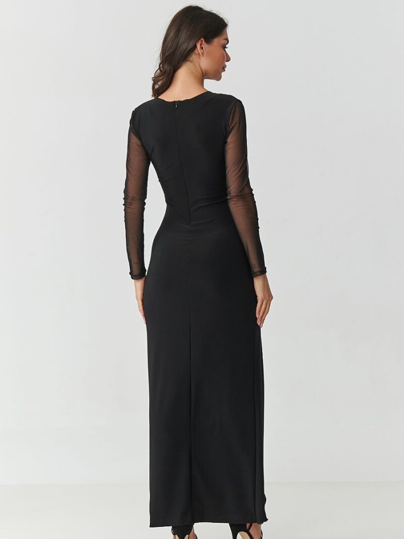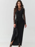 Cette robe noire maxi unique est l’essence mรชme de la classe et de la fรฉminitรฉ. Sa longueur jusqu’au sol lui donne un aspect trรจs distinguรฉ et elle est parfaite pour les soirรฉes, ajoutant de l’รฉlรฉgance et de la lรฉgรจretรฉ ร la silhouette. Le dรฉcolletรฉ en forme subtile de V, entourรฉ de tulle dรฉlicat, met joliment en valeur le cou et les clavicules, restant รฉlรฉgant. C’est un dรฉtail qui attire le regard, tout en restant sensuel et chic. La coupe ajustรฉe souligne joliment la taille. La volant le long de la jupe ajoute de la dynamique et du caractรจre ร la tenue, et la fente ร l’avant dรฉvoile lรฉgรจrement la jambe, rendant chaque pas gracieux. Le modรจle a des manches longues en tulle, soulignant la lรฉgรจretรฉ et le mystรจre de toute la tenue. La robe se ferme ร l’arriรจre avec une fermeture รฉclair, ce qui facilite l’habillage et assure un ajustement parfait et un confort de port. C’est une crรฉation pour des occasions spรฉciales – mariage, bal, remise des diplรดmes ou dรฎner รฉlรฉgant, oรน vous voulez vous sentir confiant et รฉblouissant.