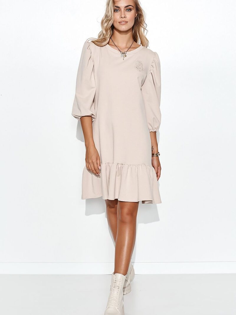 Robe romantique faite d’un sweat-shirt en maille fine et aérée. Extrêmement agréable à porter. Recommandé surtout pour les silhouettes droites. La robe a des manches légèrement bouffantes terminées par un passepoil et une encolure ronde. C’est pourquoi les femmes ayant une petite poitrine en seront particulièrement ravies. Une délicate application décorative est cousue sur le devant de la robe. Le bas de la robe est terminé par un léger volant. La robe ne couvre pas le corps, est très confortable, vous pouvez donc confortablement passer toute la journée dedans.
