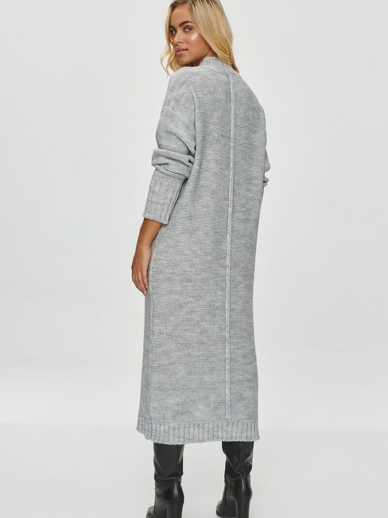 Ce pull long pour femme présente une coupe simple et classique qui descend sous les genoux, ce qui le rend idéal pour les jours plus froids. Il est confectionné dans un tissu épais et charnu, avec une structure en tricot visible. Le haut du pull est doté d’un col ras du cou arrondi, et les manches sont longues et terminées par un large ourlet, ce qui ajoute de l’élégance et de la chaleur à l’ensemble. Le motif du pull est minimaliste, sans fioritures supplémentaires, à l’exception d’une ligne verticale subtile qui traverse le centre pour allonger optiquement la silhouette. Ce pull est le choix idéal pour les jours d’hiver, alliant confort et style. Il peut être porté aussi bien avec des bottes hautes qu’avec des chaussures plus décontractées, ce qui en fait une pièce polyvalente de la garde-robe.