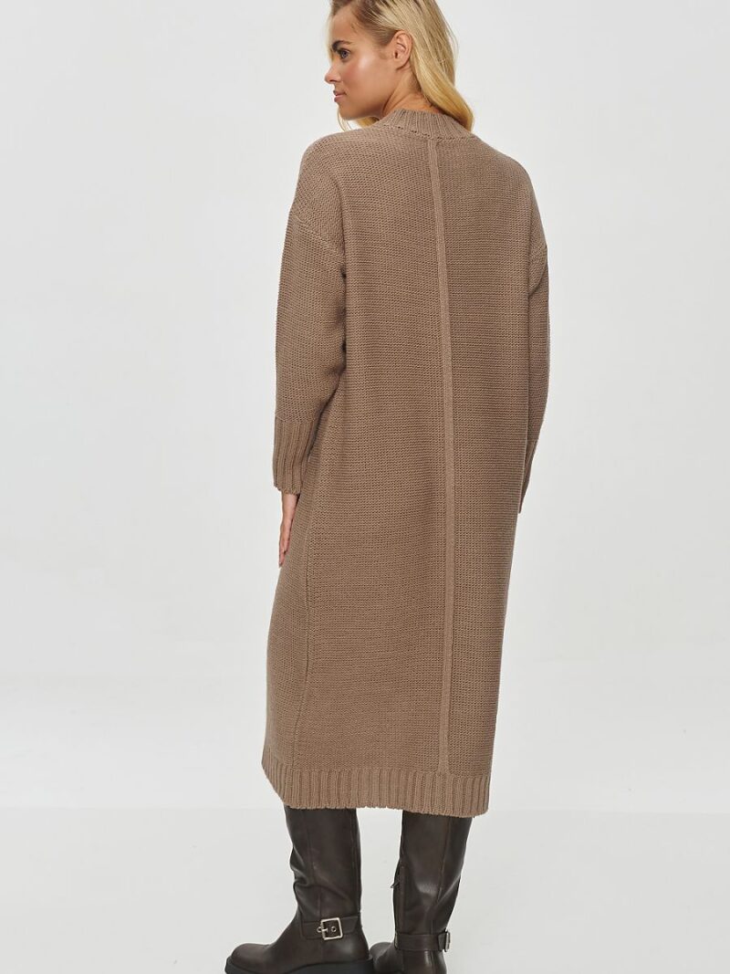 Ce pull long pour femme présente une coupe simple et classique qui descend sous les genoux, ce qui le rend idéal pour les jours plus froids. Il est confectionné dans un tissu épais et charnu, avec une structure en tricot visible. Le haut du pull est doté d’un col ras du cou arrondi, et les manches sont longues et terminées par un large ourlet, ce qui ajoute de l’élégance et de la chaleur à l’ensemble. Le motif du pull est minimaliste, sans fioritures supplémentaires, à l’exception d’une ligne verticale subtile qui traverse le centre pour allonger optiquement la silhouette. Ce pull est le choix idéal pour les jours d’hiver, alliant confort et style. Il peut être porté aussi bien avec des bottes hautes qu’avec des chaussures plus décontractées, ce qui en fait une pièce polyvalente de la garde-robe.