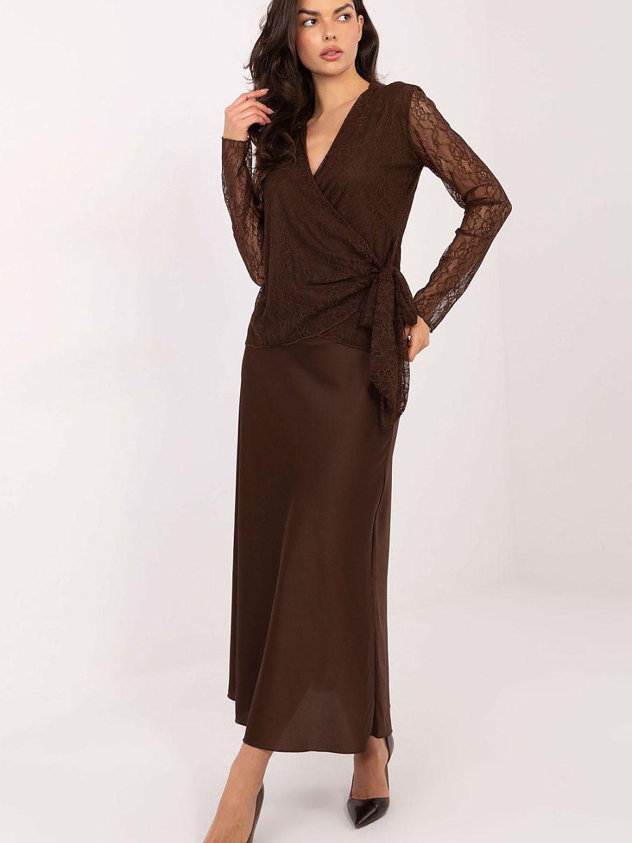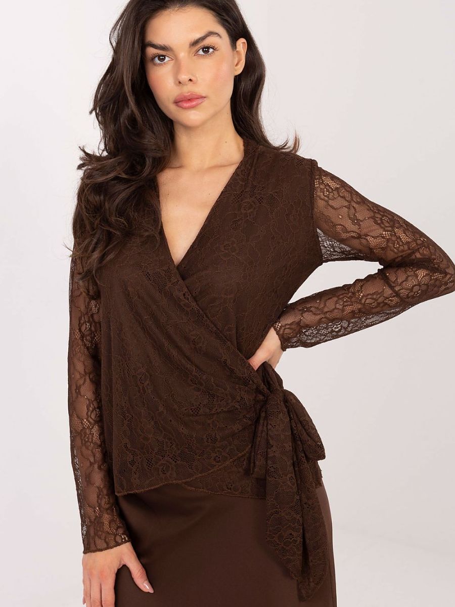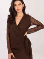 Élégante et élégante blouse en dentelle délicate est une excellente proposition pour les femmes appréciant l’élégance et la subtilité. Le modèle a une doublure qui assure confort et bonne couverture, tandis que les manches sont faites uniquement en dentelle sans doublure, ce qui ajoute de la légèreté et du charme féminin à l’ensemble. La blouse est fabriquée dans un mélange de nylon et de spandex de haute qualité, ce qui la rend élastique, agréable au toucher et parfaitement ajustée à la silhouette. Sa longueur courte la rend parfaite aussi bien avec des jupes qu’avec des pantalons élégants. Le décolleté croisé avec un joli nœud sous la poitrine du côté gauche met joliment en valeur la ligne du cou et de la taille, ajoutant une élégance exceptionnelle à la blouse. Le petit col subtil complète l’ensemble, créant un look harmonieux et classique. C’est la blouse idéale pour les occasions habillées, les réunions d’affaires et les styles élégants pour le travail.