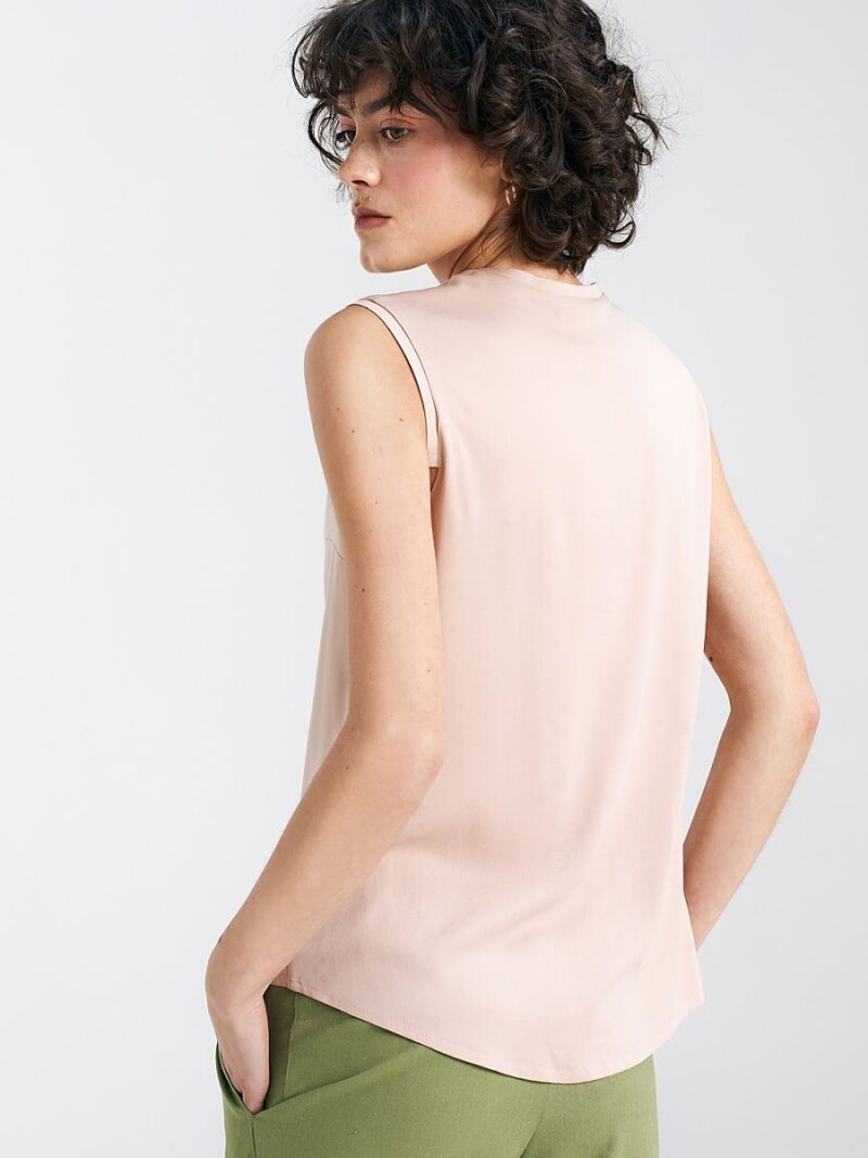 Le chemisier à coupe régulière impressionne par sa simplicité et son élégance. Elle est confectionnée dans une matière viscose agréable pour le confort et la liberté de mouvement. Son encolure en V, à la fois profonde et subtile, confère à l’ensemble une touche sophistiquée. Ce haut sans manches est le choix idéal pour les journées chaudes, car il apporte légèreté et fraîcheur à toute tenue. La finition extrêmement féminine et élégante des épaules et de l’encolure, sous la forme d’un pli délicat, confère au chemisier un charme subtil et un caractère unique. C’est le choix idéal pour celles qui apprécient à la fois le classique et une touche d’extravagance. Ce chemisier, rentré sur la tête, sera le complément idéal de votre garde-robe, ajoutant un style unique à toutes les tenues féminines.