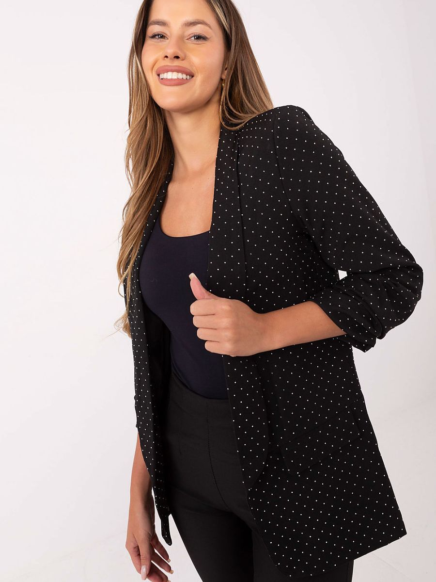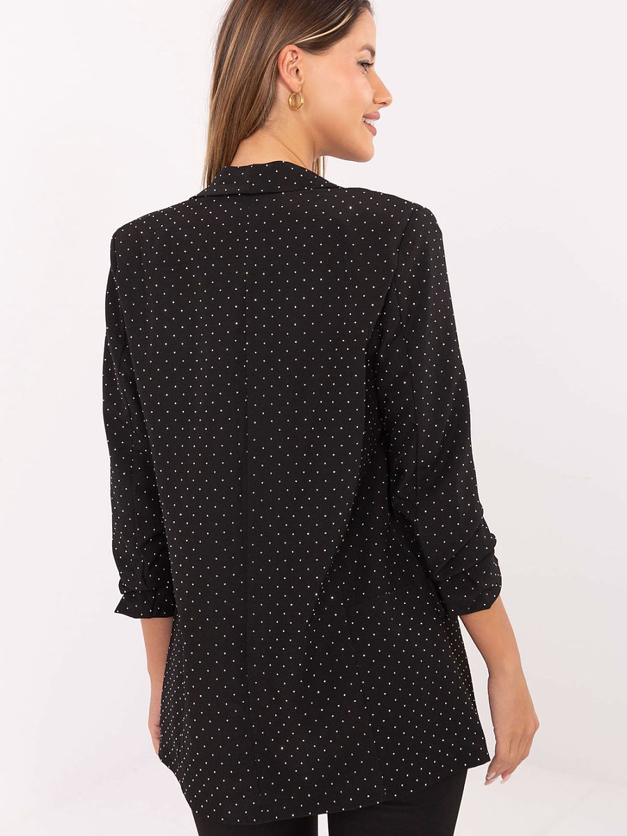 Une veste de costume élégante pour femme de longueur standard, fabriquée dans un mélange dominant de viscose et de polyester, doublée pour un confort optimal. Le modèle sans fermeture présente un caractère moderne et léger, avec des épaulettes discrètes qui soulignent subtilement la silhouette, lui donnant des proportions marquées. Toute la surface du tissu est ornée de jolis strass, qui apportent une touche de brillance et font de la veste un choix idéal pour les occasions spéciales ou les fêtes. Les manches 3/4 sont ornées de plis délicats, ajoutant une élégance féminine et un style original à l’ensemble.