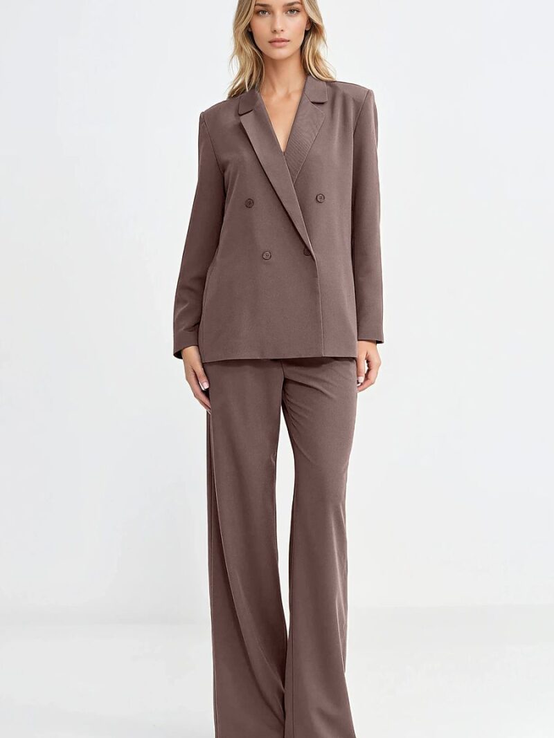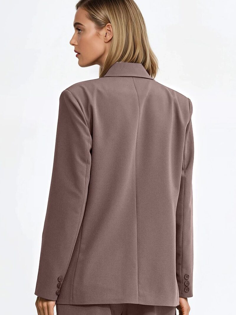 Une élégante veste de costume pour femme de coupe oversize est un incontournable dans une garde-robe moderne. Le col à revers lui donne un caractère classique, tandis que la fermeture à double boutonnage souligne le style intemporel et élégant. Le modèle est équipé de manches longues boutonnées et d’épaulettes qui sculptent joliment la silhouette et ajoutent une forme distinctive à l’ensemble. Sa longueur au niveau des hanches fait que la veste de costume se présente parfaitement dans des tenues décontractées ou plus formelles. Pour plus de confort et une finition esthétique, la veste est entièrement doublée. C’est une proposition élégante qui se marie parfaitement avec un jean, un pantalon en tissu ou une robe.